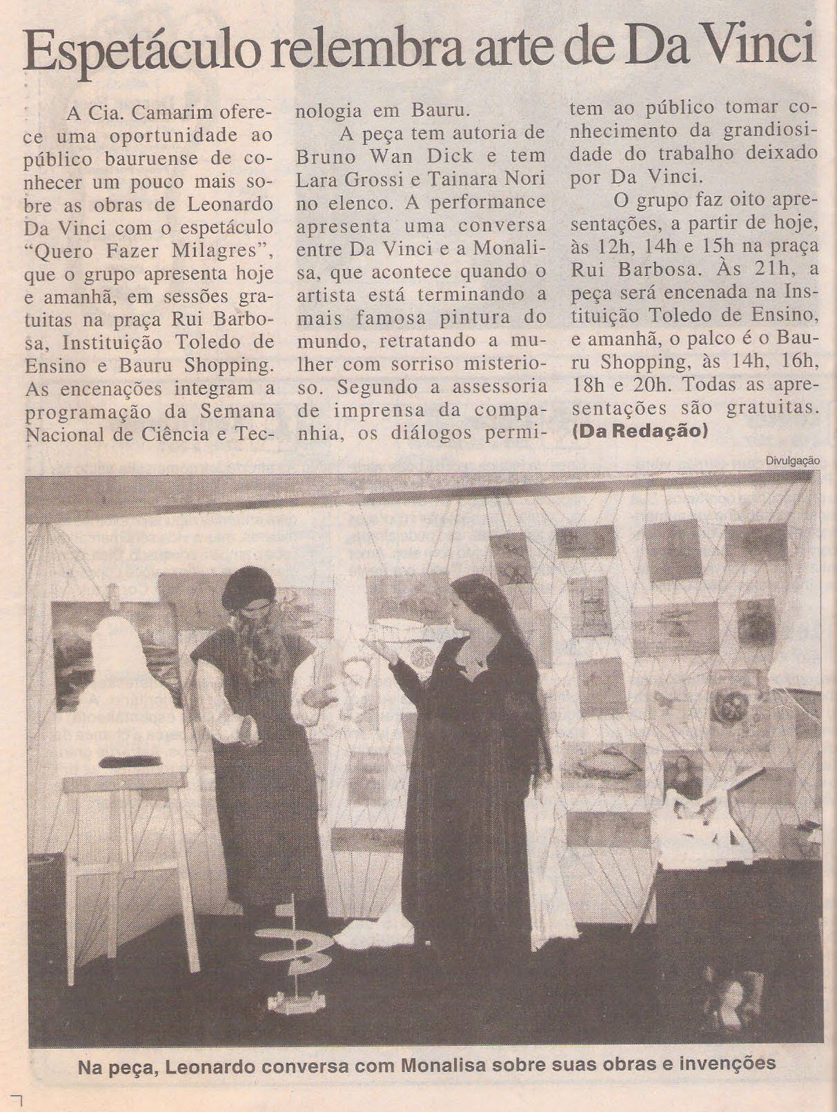 Leonardo Da Vinci é conhecido no mundo contemporâneo como um gênio da pintura, um artista imortal por sua célebre obra Mona Lisa. Além de pintor, Vinci foi também músico, poeta, escultor, inventor e, sem sombra de dúvida, um grande cientista. Neste espetáculo convidado o publico a vivenciar a arte e a ciência presentes nas obras de Leonardo Da Vinci.